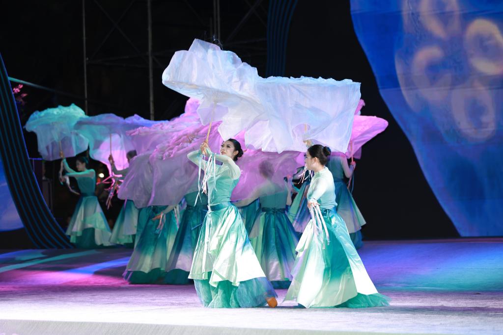 晚会开篇的情景剧《思源》中,学子们以细腻的肢体语言和饱满的情感,再现了万绿湖建设背后“饮水思源”的移民故事,让观众在沉浸式体验中触摸历史脉络,为整场晚会奠定了厚重的人文基调。女子群舞《桃花水母》里,同学们通过精准的队形变换与灵动身姿,将这种濒危水生生物的翩跹之态化为舞台上的视觉奇观,既展现了生态保护的时代命题,也彰显了青年对自然之美的独特诠释。