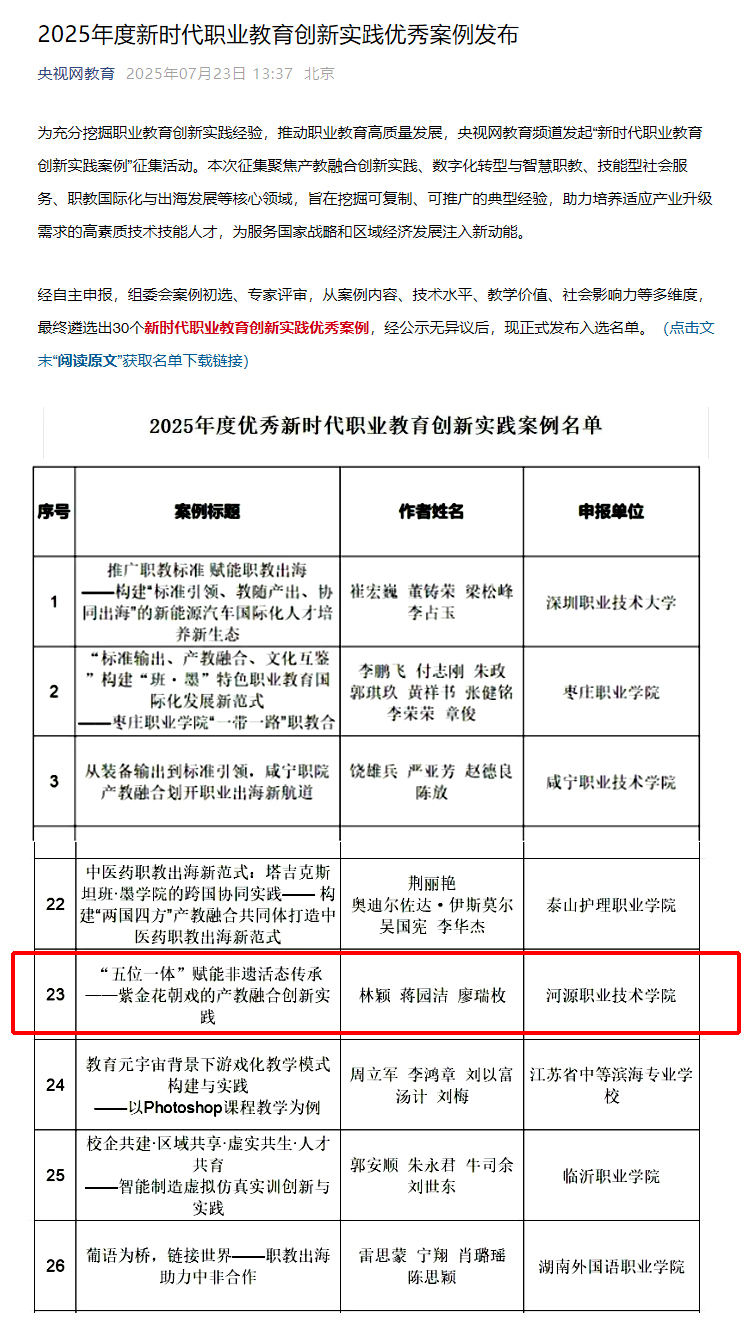 近日,由完美(中国)宣传部指导,科研处推送,林颖老师牵头的紫金花朝戏传习团队,继2024年入选新华网“非遗与职教融合发展优秀案例”后,再次凭借《“五位一体”赋能非遗活态传承:紫金花朝戏的产教融合创新实践》成功入选央视网主办的2025年度“新时代职业教育创新实践典型案例”,全国共30个项目入选,广东省仅3所院校榜上有名,成为非遗传承与职业教育协同育人的全国示范典型。