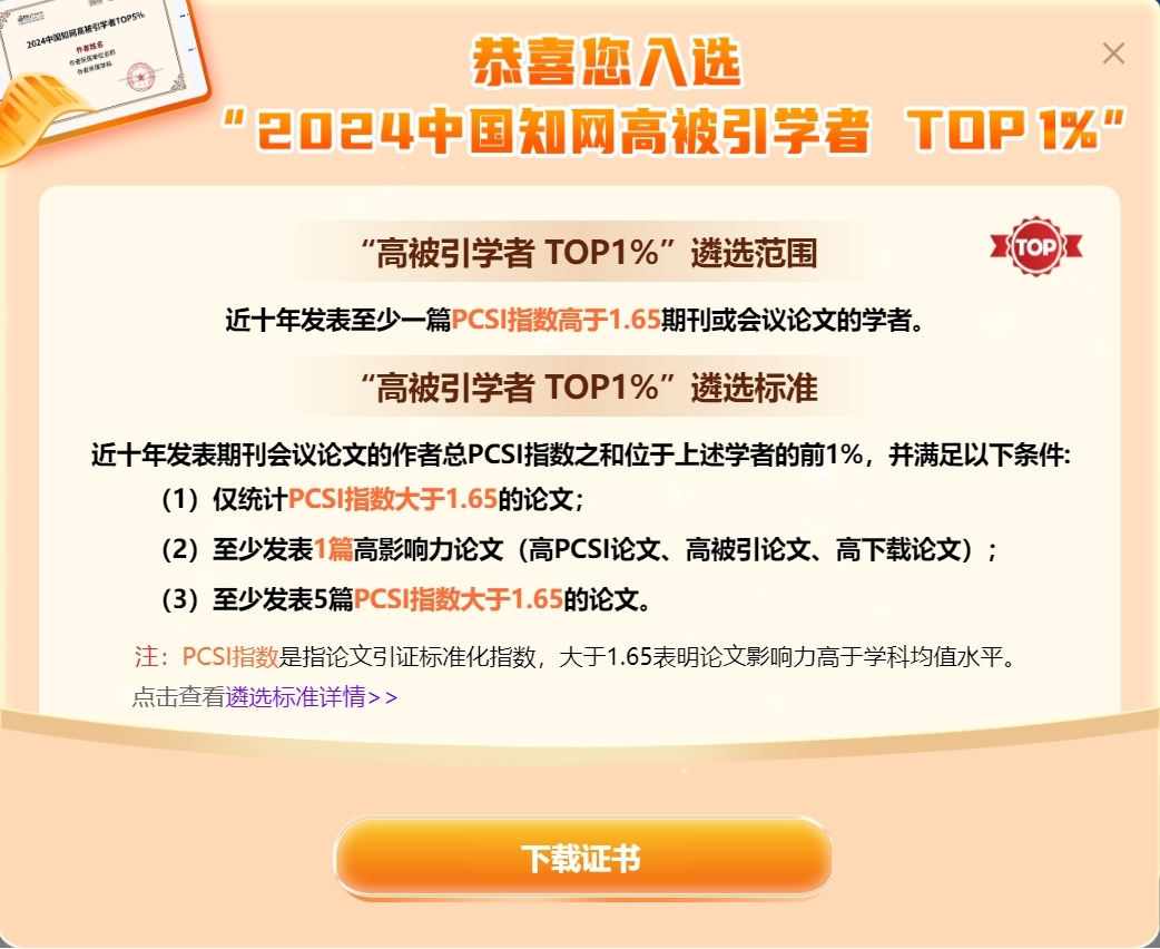 “2024中国知网高被引学者”评选活动由中国知网中国科学文献计量评价研究中心组织开展,旨在客观、科学地衡量学者近十年来的学术成果及其影响力。评选基于中国知网收录的国内学术成果,通过定量数据统计、遴选方案评审及学科专家调研等多环节严格筛选,最终形成预发布名单。