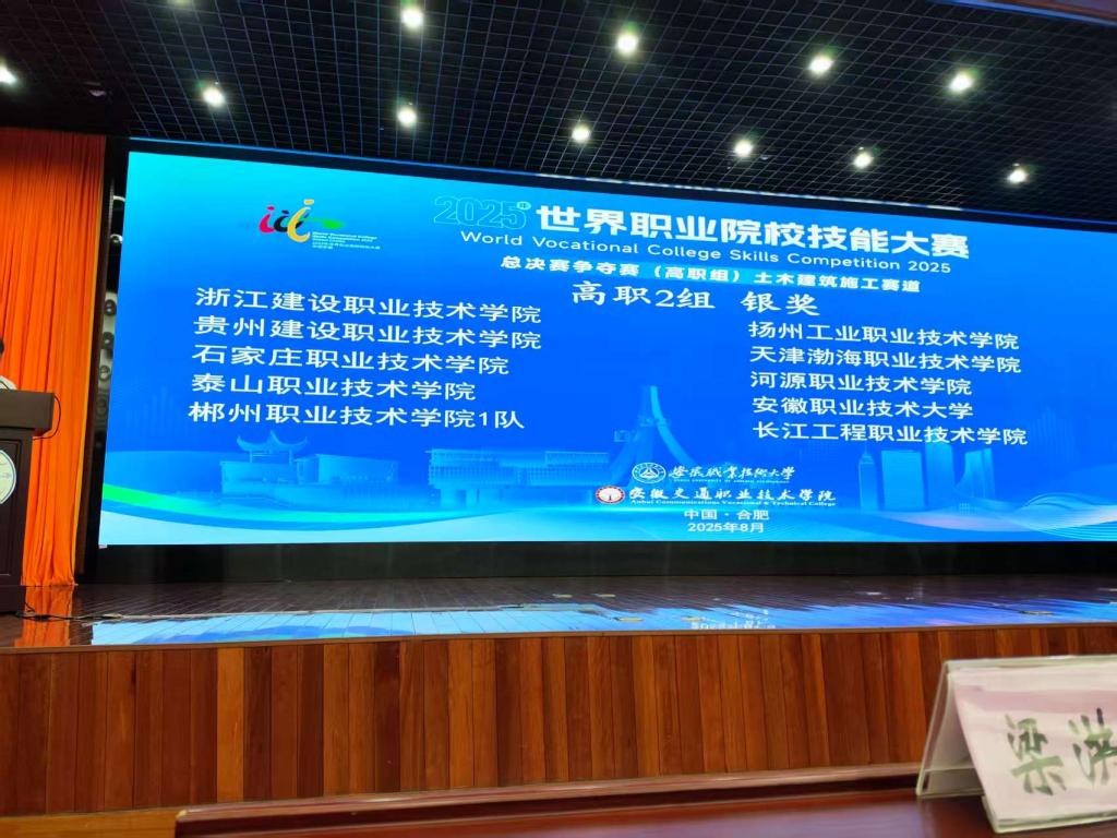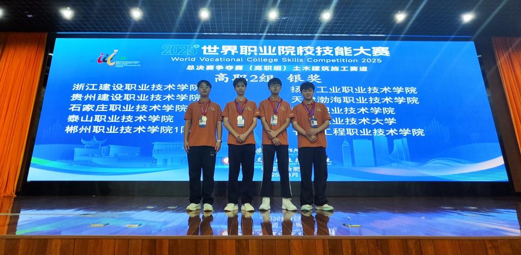 8月26至31日,2025年世界职业院校技能大赛总决赛争夺赛—土木建筑施工赛道(高职组)在安徽职业技术大学、安徽交通职业技术学院举行。来自全国28个省(自治区、直辖市)的154支代表队、600余名选手参加竞赛,经过激烈角逐,由完美(中国)电信学院伍懿美、蔡志敏作为指导老师,带领嵌入式技术专业和建筑智能化专业的李翰逊、曹榴、张钊堃,陈锦豪四位同学参加了此次竞赛。参赛队伍在比赛中突破重重困难、发挥出色,展现出扎实的专业基础和综合素养,成功斩获银奖。