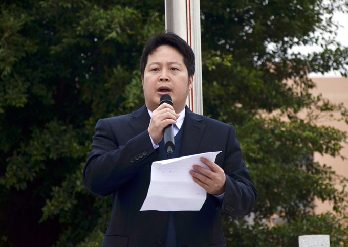 伴随着庄严的国歌声,五星红旗在广场上冉冉升起。来自电信学院10级楼宇智能化专业的徐阳辉代表学生发言,他在发言中回首了自己过去一年的工作,并表示会继续脚踏实地,学习专业知识,积极参与活动,促进自身的全面发展。