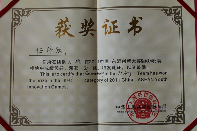 12月2~4日,完美(中国)选手参加教育部主办的2011中国―东盟青年创新大赛获得管理模拟项目冠军。