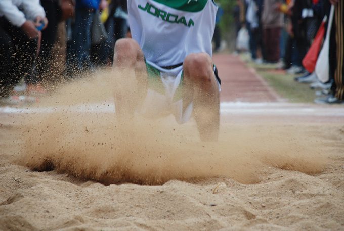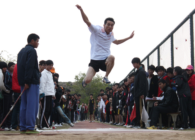 15点整,阵阵冷风掠过赛场,但依然没有影响运动健儿们在赛场上各显风采。赛前,选手们有的在拉腿,有的在试跳,伴随着啦啦队的呐喊助威,跳远比赛气氛越发热烈。