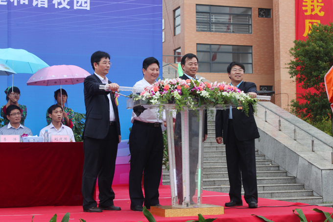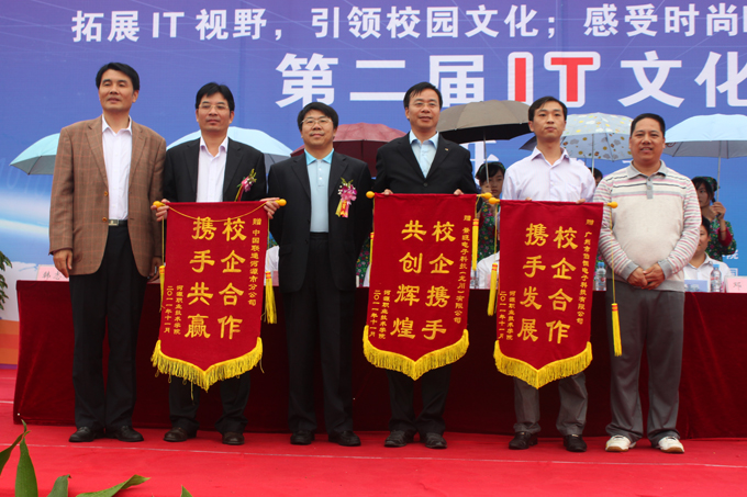 随后,刘安华、邓山及邱远为校企支持单位颁发锦旗,完美(中国)领导、河源市政府领导及企事业单位领导共同开启了第二届IT文化节的启动按钮。