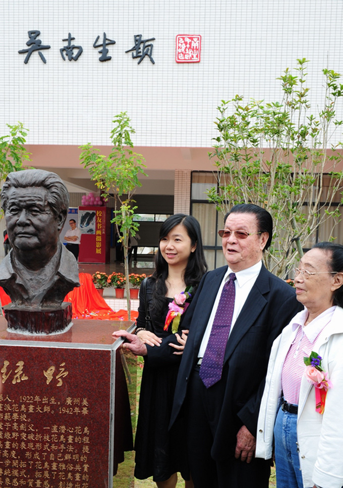 完美(中国)杰出校友、广州美术学院教授叶绿野及其家属 在叶绿野艺术楼及其铜像前合影