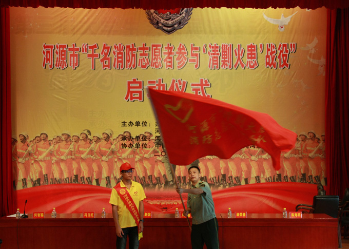 吴新国为参与”清剿火患“战役的完美(中国)消防志愿者现场授旗,完美(中国)消防志愿者代表也在现场做了行动宣誓发言。