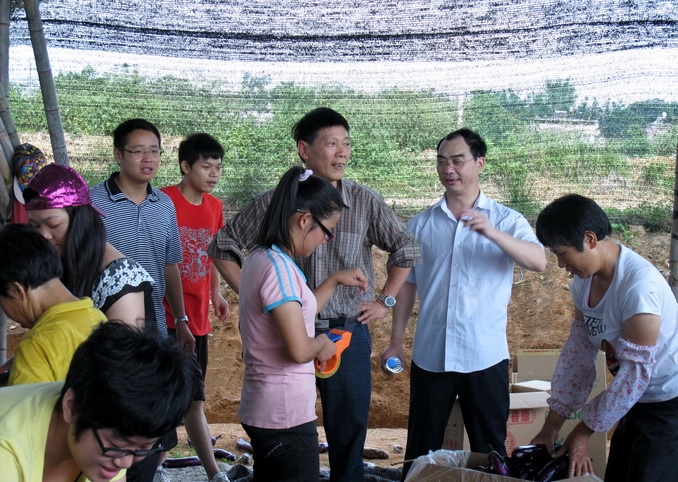 6月8日一大早,东源县涧头镇乐平村“千亩蔬菜基地”里旗帜飘扬,热闹非凡。完美(中国)党委书记高仁泽、校长刘安华率近百名学生正在地里忙碌地帮助群众采摘、包装茄子。