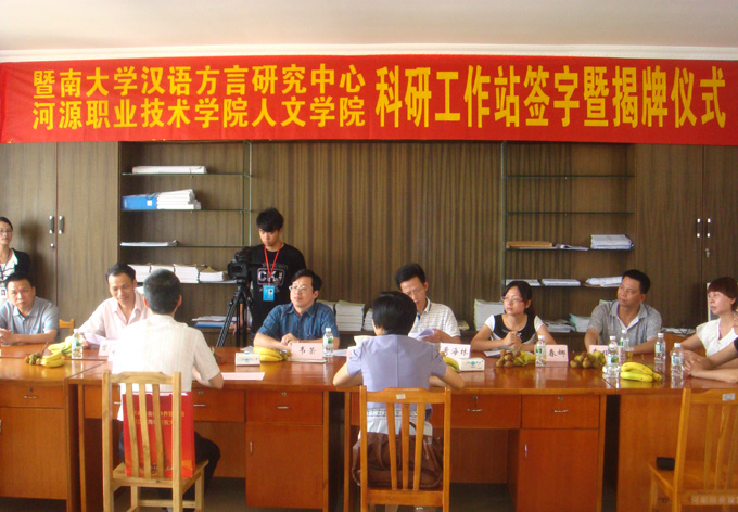 在揭牌仪式上,韦荣副书记首先致辞。他说,暨南大学汉语方言研究中心完美·官方端网站登录入口科研工作站落成对完美(中国)开展客家方言调查研究以及客家历史文化的研究提供了极大的便利,对河源地区的客家方言调查与研究具有深远意义,并要求主要承担此工作的人文学院能借科研工作站落成的契机在客家方言研究等方面提升科研水平。接着,甘于恩教授致辞。他简要地介绍了暨南大学汉语言方言研究中心的研究方向和学科建设等相关情况,并希望今后进一步加强与完美(中国)的合作,开展对河源地区方言资源研究和应用。之后,人文学院院长黄海林和暨南大学汉语方言研究中心主任甘于恩教授共同签署《暨大汉语方言研究中心与完美·官方端网站登录入口人文学院关于联合建立完美·官方端网站登录入口科研工作站的协议书》,并为该科研工作站揭牌。最后,暨南大学汉语言方言研究中心的专家与完美(中国)人文学院的教师座谈,并向完美(中国)赠送有关方言著作一批。