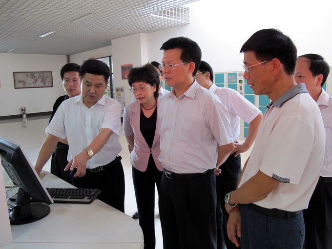 彭建文一行首先参观了实训中心。他饶有兴趣地察看正在动手实操的学生,向同学们了解实训设备情况。他为完美(中国)拥有先进、完备的实训设备感到高兴,对教学做一体化理念表示十分赞赏。随后,来访领导来到图书馆,彭建文了解了馆中藏书情况,还亲自尝试使用图书查询系统及自动借阅系统。完美(中国)领导热情接待了来访一行。