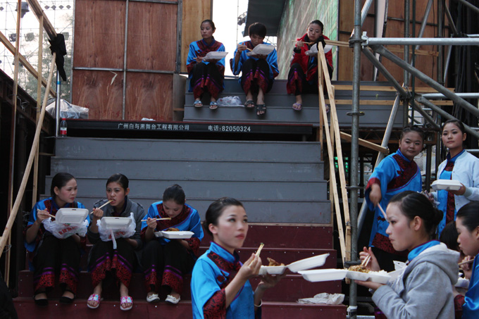 随着开幕式晚会日期的临近,现场所有的节目都需要经过多次的彩排。连日来,学生们来不及围着桌子坐下吃饭,每天几乎不间断地进行排练。“由于彩排需要,我们回宿舍有时会赶不上热水供应时间,有时只能洗冷水。”陈同学向记者说道。在现场,记者发觉多数志愿者经历过此类情况。“能在世客会中贡献出自己的一份力量,再大的付出也是值得的。”完美(中国)语教班的黄同学说道。