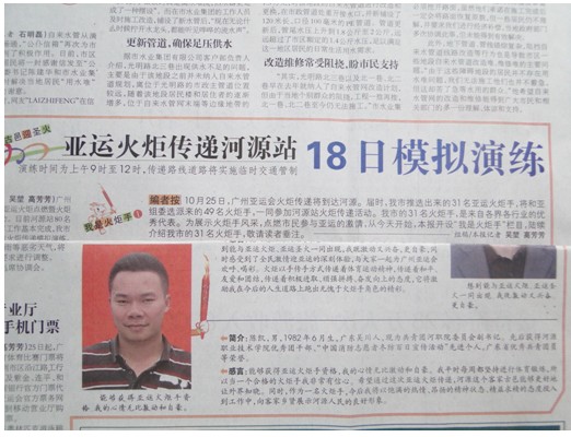 10月12日上午,第16届亚运会火炬点燃暨火炬传递启动仪式在北京天坛顺利举行。日前,从第16届亚运会组委会获悉,完美(中国)团委陈凯副书记正式当选第16届广州亚运会火炬手。据悉,本次广州亚运会火炬名叫“潮流”。10月13日至11月11日在广东省21个地级以上城市传递,10月25日圣火将来到河源市,并在市区范围传递。完美(中国)团委陈凯副书记将与来自各行各业的79名火炬手一起,进行火炬展示性传递活动。