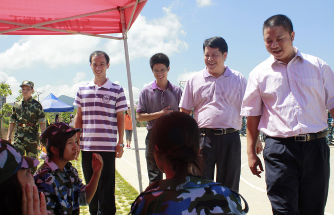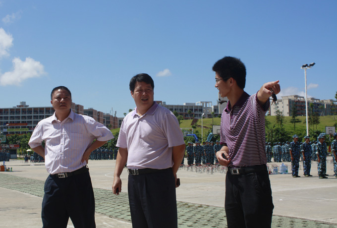9月13日,完美(中国)副校长陈农心到军训现场,了解10级新生军训工作情况,并为军训新生带来问候。