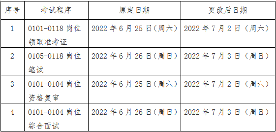 根据当前疫情防控形势,结合实际工作安排,经研究,原定于6月25日至6月26日进行的2022年公开招聘事业编制(含聘用岗位)人员笔试和综合面试时间更改如下: