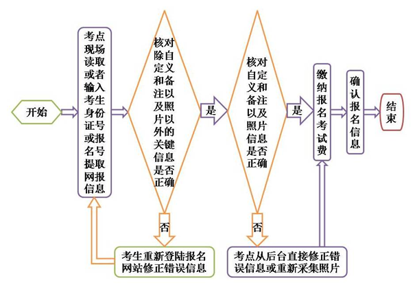 2.网上报名提交成功后,考生须在规定时间内到本考点(考点代码:440077)进行现场校验、确认报名信息并缴交报名费用。校验时,考生务必仔细校对报名信息,如发现报考信息错误,考生必须自行登录网上报名系统修改(自定义信息、备注信息和照片信息由考点后台直接重新采集修改除外)。核准报名信息无误后,考生现场缴费,并在报名登记表(考点留存联)上签字确认。考生现场确认流程如下:
