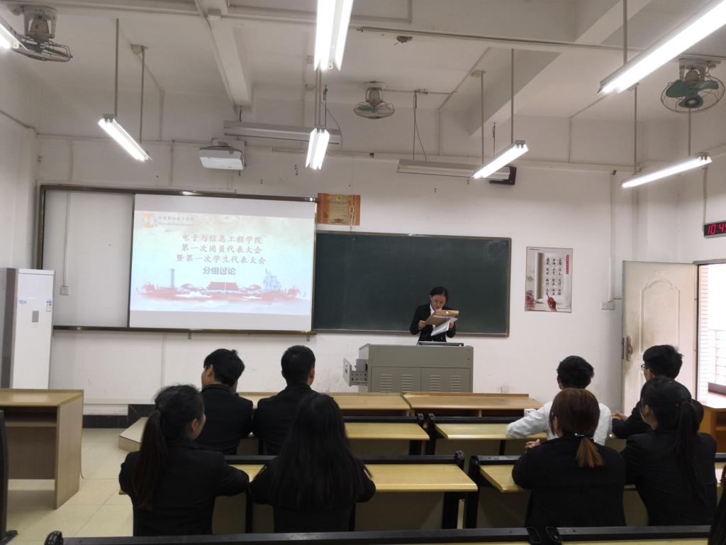 会议伊始,由各代表团的联络员带领代表们移步至指定教室分组讨论《电子与信息工程学院第十一届团总支工作报告》、第十一届学生会的《学生会工作报告》、本次会议的《提案工作报告》,并商讨会议的选举办法、《第十二届团总支委员会委员建议名单》、《第十二届学生委员建议名单》和大会总监票人、监票人、总计票人、计票人建议名单。