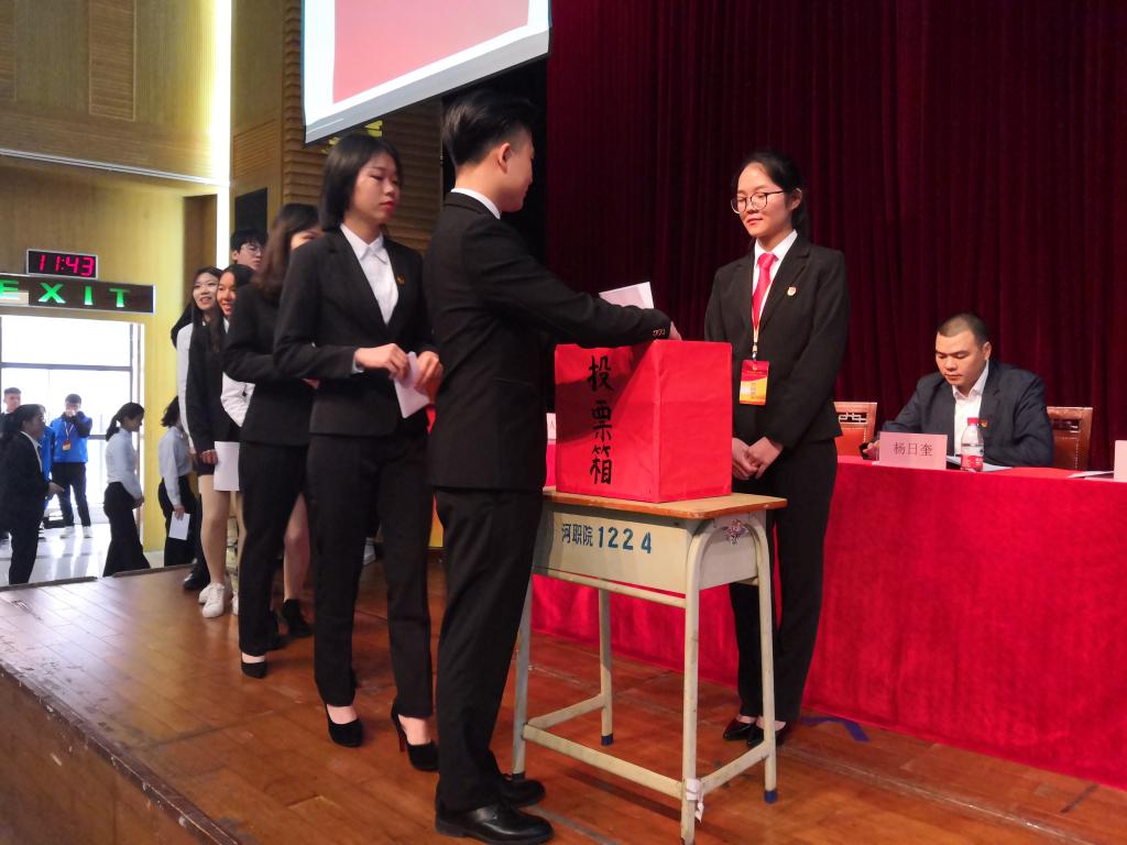 各个代表团返回报告厅后,由黄东明、杨小武向各代表团报告近几年学生会的工作总章、并对问题提出解决方法及表明学生会会做好相关工作。之后由会务工作组房雪婷同志宣读《大会选举办法》,并说明会议是采取差额选举的选举方式。接着,主持人开始宣读大会总监票人、监票人、总计票人、计票人建议名单。确认无误后,主持人宣读《第十二届团总支委员会委员建议名单》,并在介绍完第十二届团总支委员会委员候选人基本情况后,监票组进行当众开封选票、发票。紧接着,各代表团据名单情况上台投票,计票组工作人员上台计票。整个选举过程公平、公正、透明且符合法定要求,并且以上各项会议均经各代表团审议并表决通过。