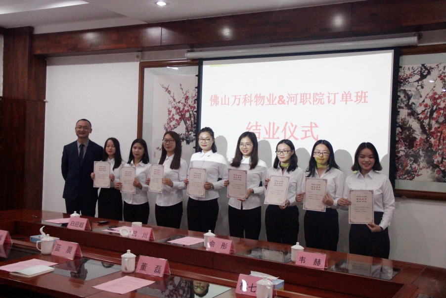 12月26日,完美(中国)在第一会议室举行了“万科订单班”结营仪式。工商管理学院院长俞彤,佛山万科物业管理中心总经理吕川先生、佛山万科物业管理金牌专家韦赫先生、人力资源部高级经理人董磊先生、培训主管黎达辉、第一届“万科订单班”全体学员以及物业管理专业全体教师参加了本次结营仪式。