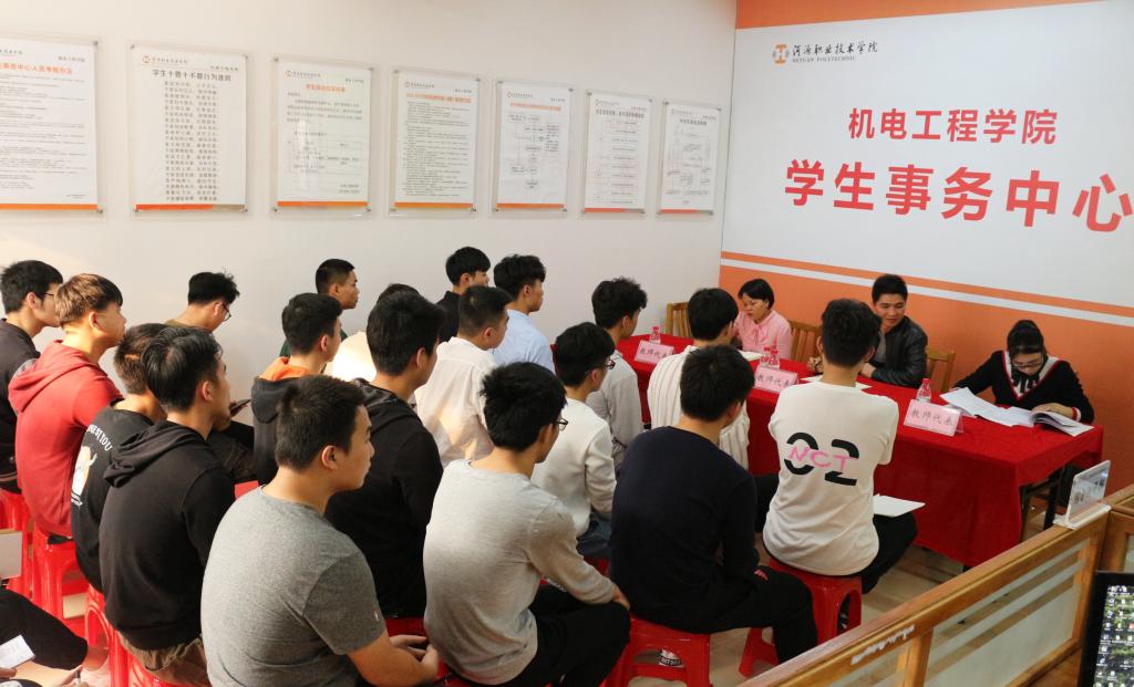 3月26日下午,机电学院在学生事务中心开展学生接访日活动,出席此次活动的有廖晓明副院长,教师秘书谢新媚、蔡平英以及2018级的23个班级学生代表。