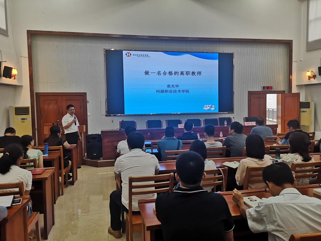 袁光华副校长为全体教职工作师德师风专题教育学习讲座。他主要从我是谁、我是做什么的、我如何做好它等三方面讲解做一名合格的高职教师,并学习解读了《新时代高校教师职业行为十项准则》。