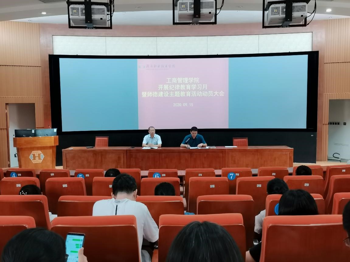9月15日下午,工商管理学院在实训楼三期3D导游实训室召开2020年纪律教育学习月暨师德建设主题教育月活动动员大会,学院全体教职工参加会议。会议由学院党总支书记、院长俞彤主持。