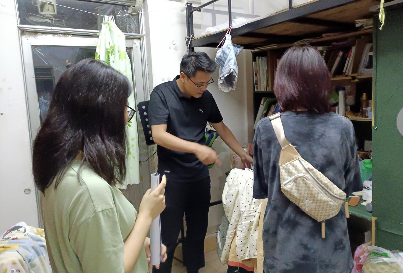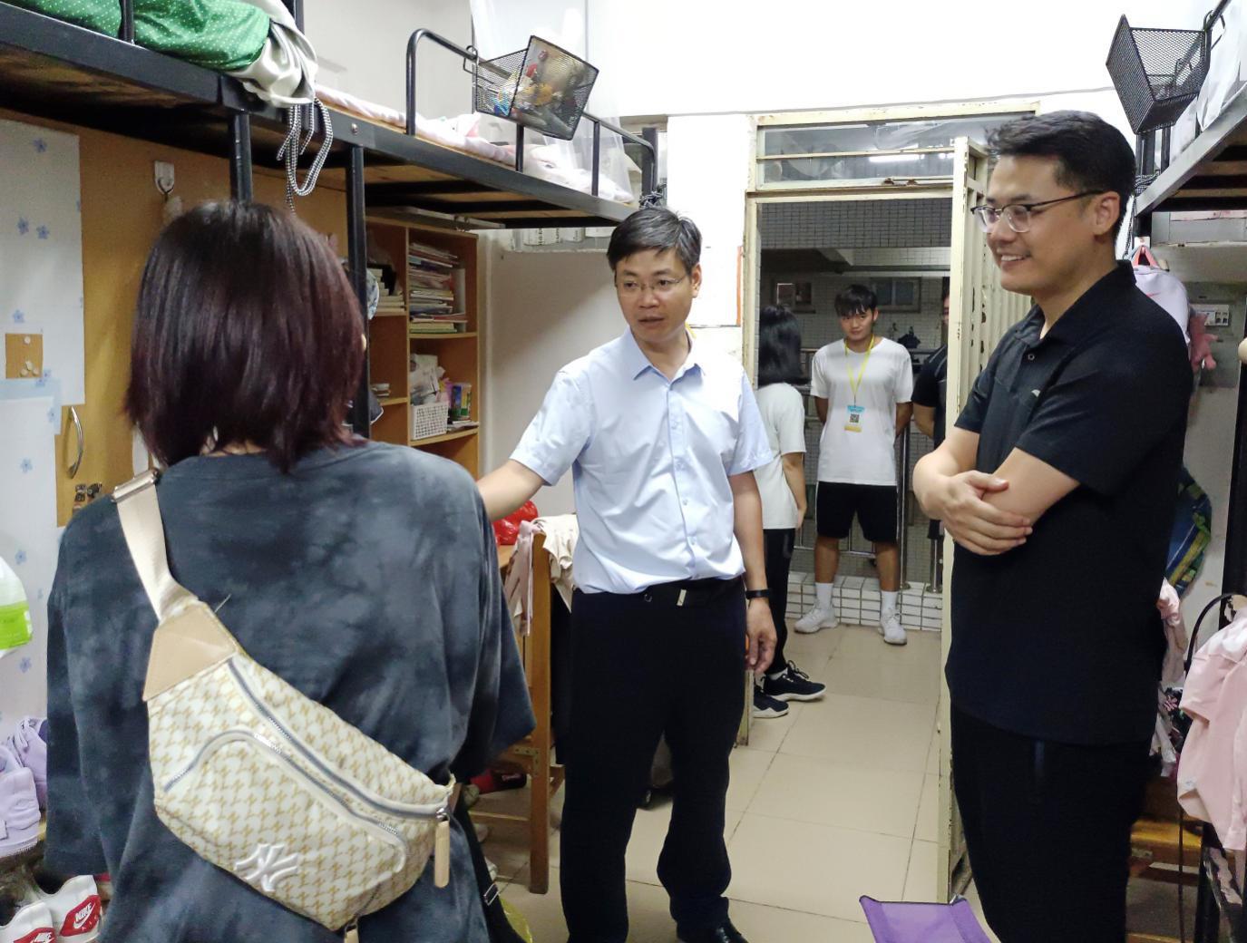 院长杜伟祥(右二)和副书记张超(右一)询问宿舍卫生情况