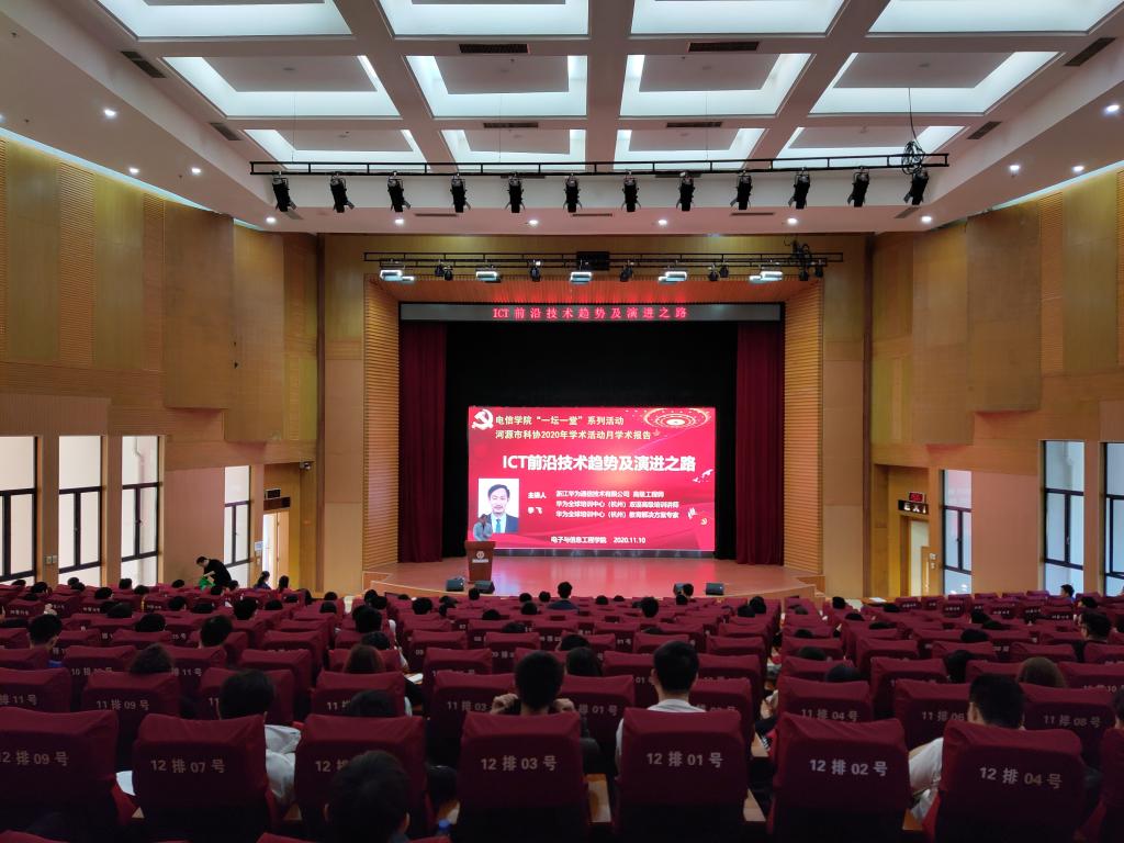 11月10日下午,电信学院在图书馆报告厅开展“一坛一堂”系列活动之“ICT前沿技术趋势及严演进之路”学术讲座,主讲嘉宾为浙江华为通信技术有限公司高级工程师李飞。讲座由电信学院副院长周永福主持,移动通信技术、计算机网络技术、嵌入式技术与应用、大数据技术与应用4个专业的部分学生共200余人参加了讲座。