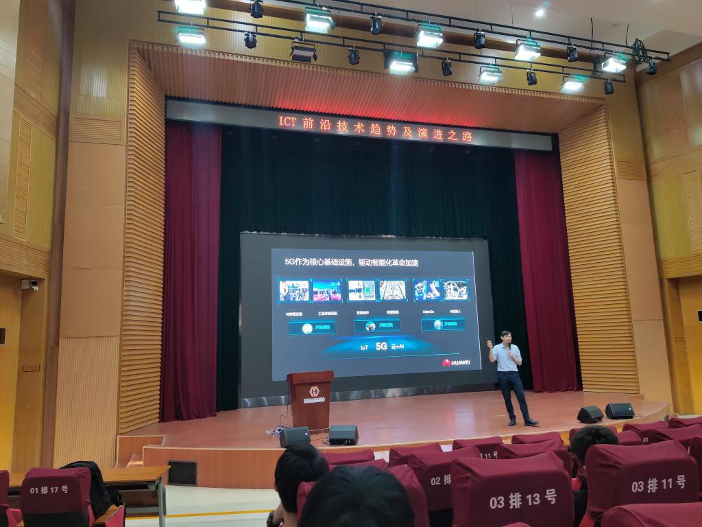 讲座上,李飞首先介绍了华为公司的基本情况,接着从5G前沿技术及趋势、华为5G解决方案、IT前沿技术趋势、华为鲲鹏&昇腾解决方案等四个方面作了全面的介绍和分析。其讲解结构完整、思路清晰、内容深刻,重点介绍了5G关键技术、5G三大能力(eMBB、URLLC、mMTC)、5G产业趋势、华为5G网络全球部署情况、ICT行业技术演进和人才需求等内容。期间,李飞主动与学生开展互动,解答相关技术问题。两个半小时的讲座不仅让同学们更深入的了解了自己的专业,更让大家了解了专业未来的发展方向。