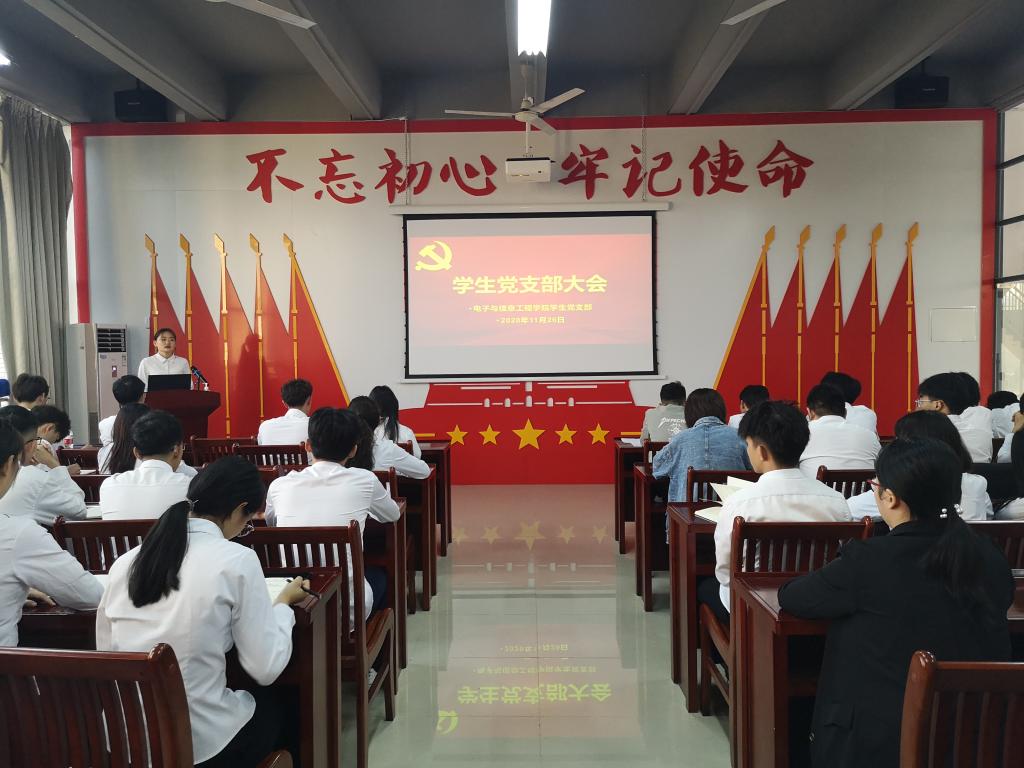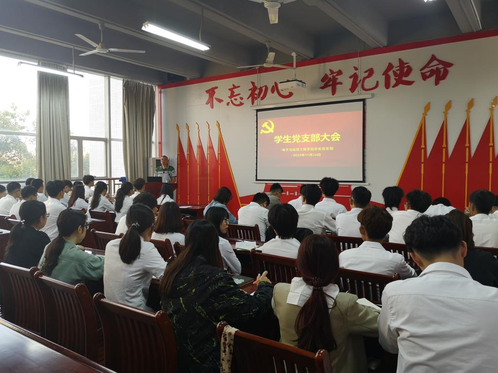 11月26日,电信学院学生党支部在实训楼B306召开支部大会,深入学习研讨“习近平总书记出席深圳经济特区建立40周年庆祝大会和视察广东重要讲话重要指示精神”,学生党支部全体党员参加了会议,会议由学生党支部书记杨日奎主持。