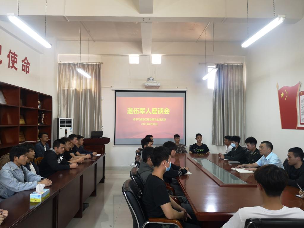 2021年3月25日,电信学院学生党支部在实训楼B307召开退伍军人座谈会。参加会议的人员有:团总支学生会主席团、党务工作小组代表、退伍军人。会议由学生党支部书记杨日奎主持。