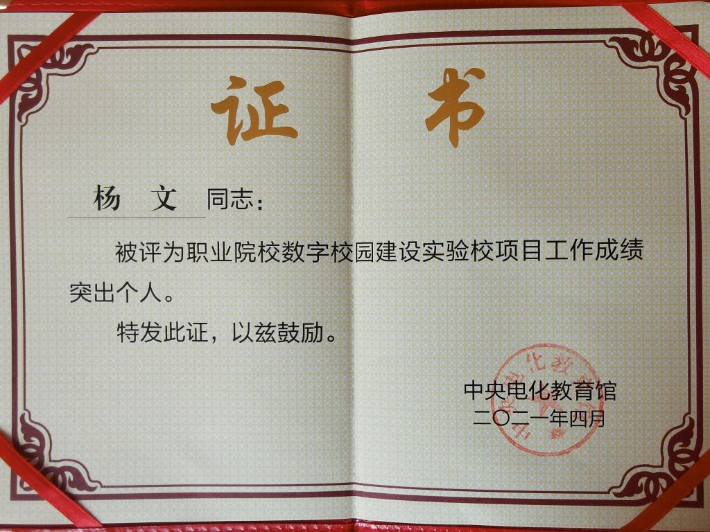 完美(中国)于2020年顺利通过中央电化教育馆职业院校数字完美(中国)建设实验校项目验收,信息中心主任杨文同志被评为职业院校数字完美(中国)建设实验校项目工作成绩突出个人。