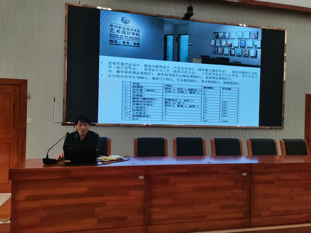 紧接着,学院副院长王方针对5月份在深圳职业技术学院跟岗学习3周的所见所闻所想,从深职院艺术设计学院的人员规模、课程建设、专业设置、人才培养、教育教学、学习感悟等方面对全体教师进行了详细的介绍和分享,对今后的专业建设和人才培养工作提出了建设性的意见。