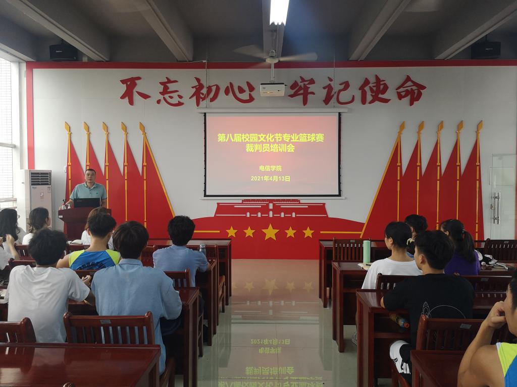 2021年4月13日,学院学生会体育部举行专业篮球赛项目组比赛“裁判员”培训会,主讲人:杨日奎老师。