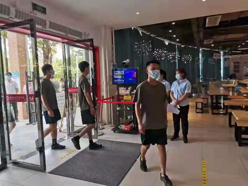 为了做好此次演练工作,资产后勤处专门制订了演练方案,明确演练时间、地点、准备工作、参加人员和演练流程。演练中,根据活动流程安排,所有人员自觉佩戴口罩,在食堂门口间隔一米排队,进行手部消毒,在食堂入口处进行体温检测。体温正常人员方可进入食堂,体温异常人员由专人带至医务室留观监测点进行研判并做出及时处置。进入食堂后,引导员引导就餐人员按照地面标示路线,有序排队打卡取餐,按照要求实行单人单桌就餐。入座就位后,就餐人员把口罩取下扣在餐桌隔板上,安静有序就餐。就餐完毕,由出口排队离开并将餐具放置指定回收处。