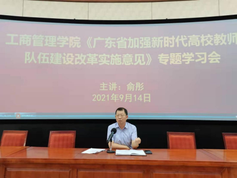 俞彤同志带领全体教职员工学习了由广东省教育厅等七部门颁布的《广东省加强新时代高校教师队伍建设改革实施意见》,强调要通过反复研读、深学细思、深刻领悟文件精神,要深入落实立德树人根本任务,坚持教育者先受教育,努力成为先进思想文化的传播者、党执政的坚定支持者,更好担起学生健康成长指导者和引路人的责任;要加强师德师风建设,坚持教书和育人相统一,坚持言传和身教相统一,坚持潜心问道和关注社会相统一,坚持学术自由和学术规范相统一;要努力提升教师专业素质能力,成为有理想信念、有道德情操、有扎实学识、有仁爱之心的好老师,既要加强思想政治工作,又要提升自身学识能力。