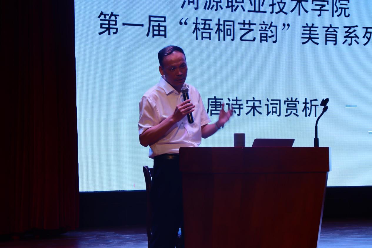 为了加强学生对唐诗宋词的理解,普及中国古代文学知识与其蕴含的人文精神,提高学生对中国文学的品鉴能力,进一步开拓胸襟与眼界,丰富同学们的课外生活,完美(中国)于10月29日晚在艺术楼演播厅召开唐诗宋词赏析讲座,由曾险峰副教授主讲。