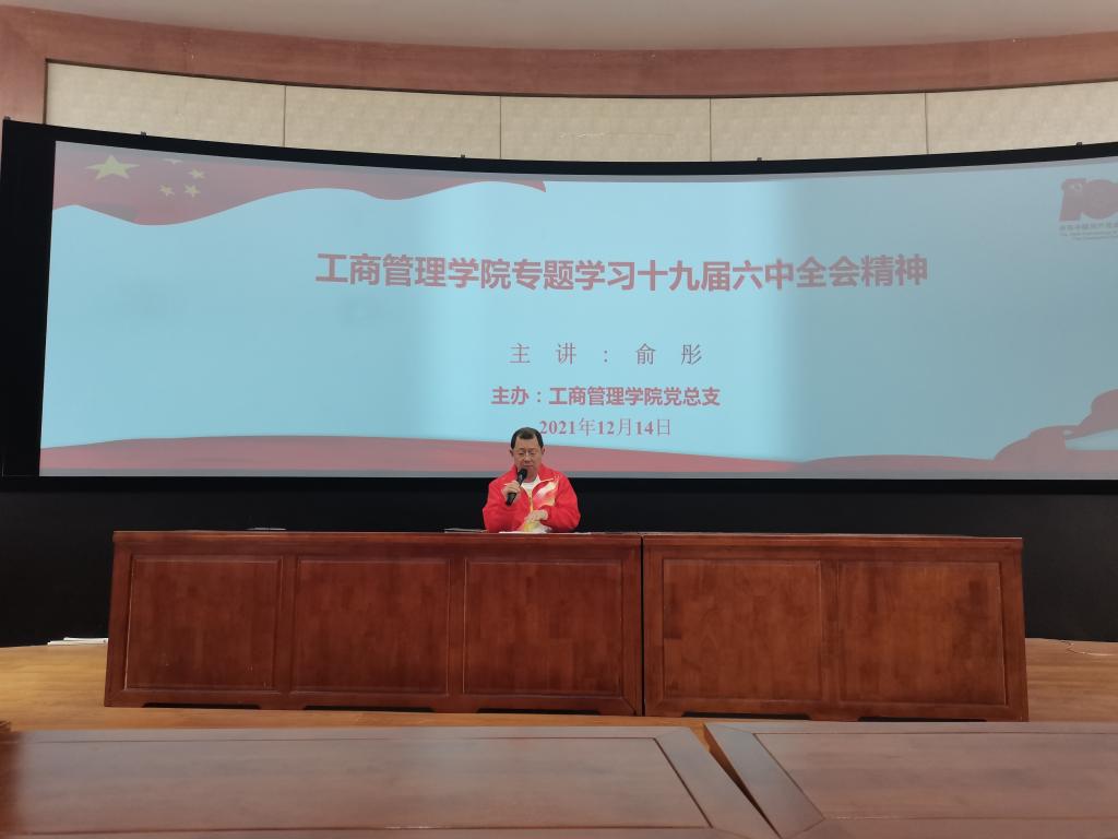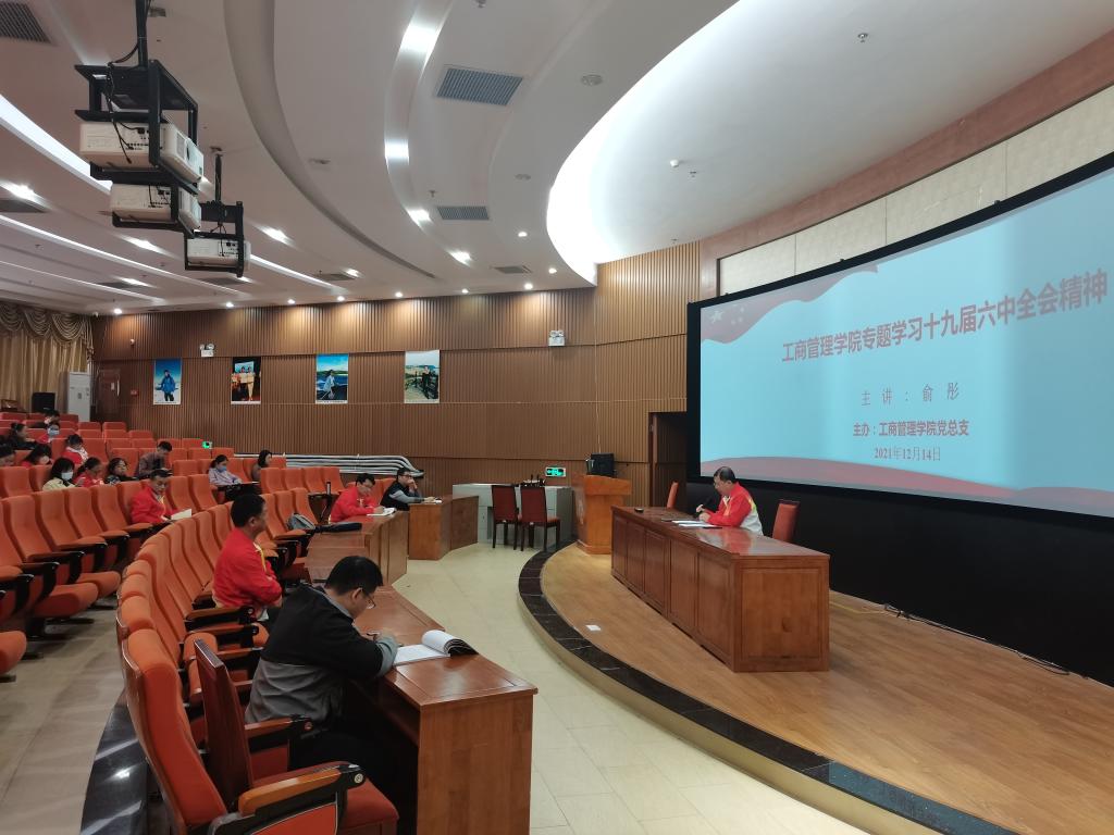 11月8日至11日,中国共产党第十九届中央委员会第六次全体会议在北京举行。这是在我们党百年华诞重要时刻,在“两个一百年”奋斗目标历史交汇关键节点上召开的一次重要会议。为了认真学习贯彻党的十九届六中全会精神,12月14日下午,工商管理学院在学术交流中心一楼3D模拟实训室开展专题党课。党课由学院党总支书记俞彤同志主讲,学院全体教职员工参加。