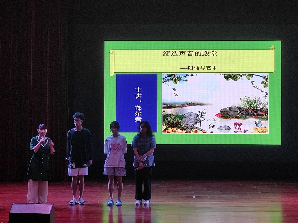 最后的声音弹性部分中,郑老师设置拉长气息的对话,学生们踊跃举手,主动上台表演对话。郑老师让两名同学之间隔出一段距离,用喊话模式表演对话内容,学生们在台上尽情地展示。通过此次讲座,学生们真正感知到朗诵的艺术之美,语音语调的变化带来的美感,都表示对朗诵有了新的认知。