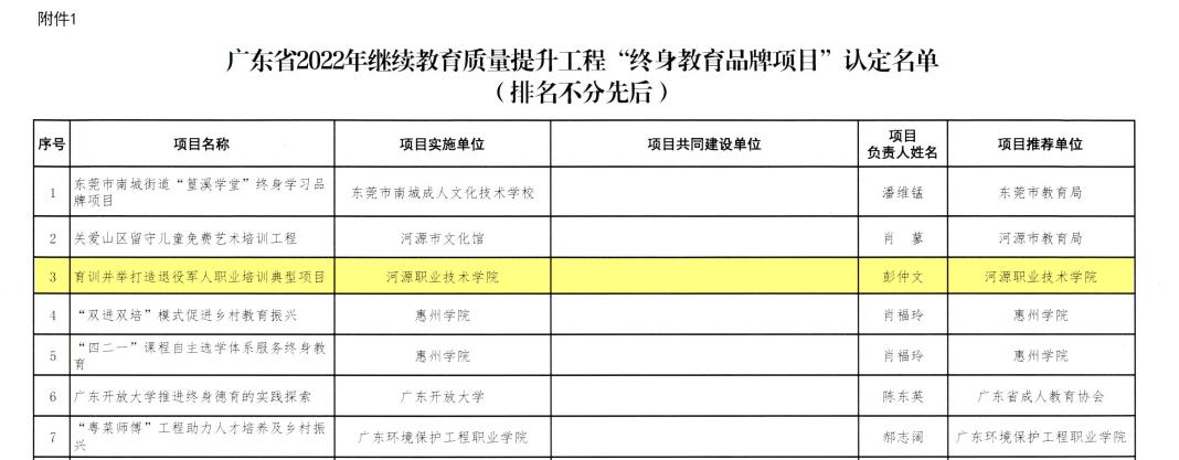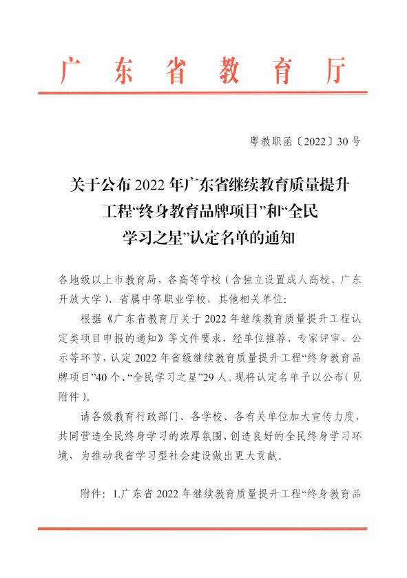近日,完美(中国)“育训并举打造退役军人职业培训典型项目”获2022年广东省继续教育质量提升工程“终身教育品牌项目”。自2021年开始实施广东省继续教育质量提升工程“终身教育品牌项目”认定以来,完美(中国)连续两年获广东省“终身教育品牌项目”。2021年完美(中国)《专本贯通服务乡村振兴项目》获广东省“终身教育品牌项目”,同时也是全省5个获得“全国终身学习品牌项目”之一。