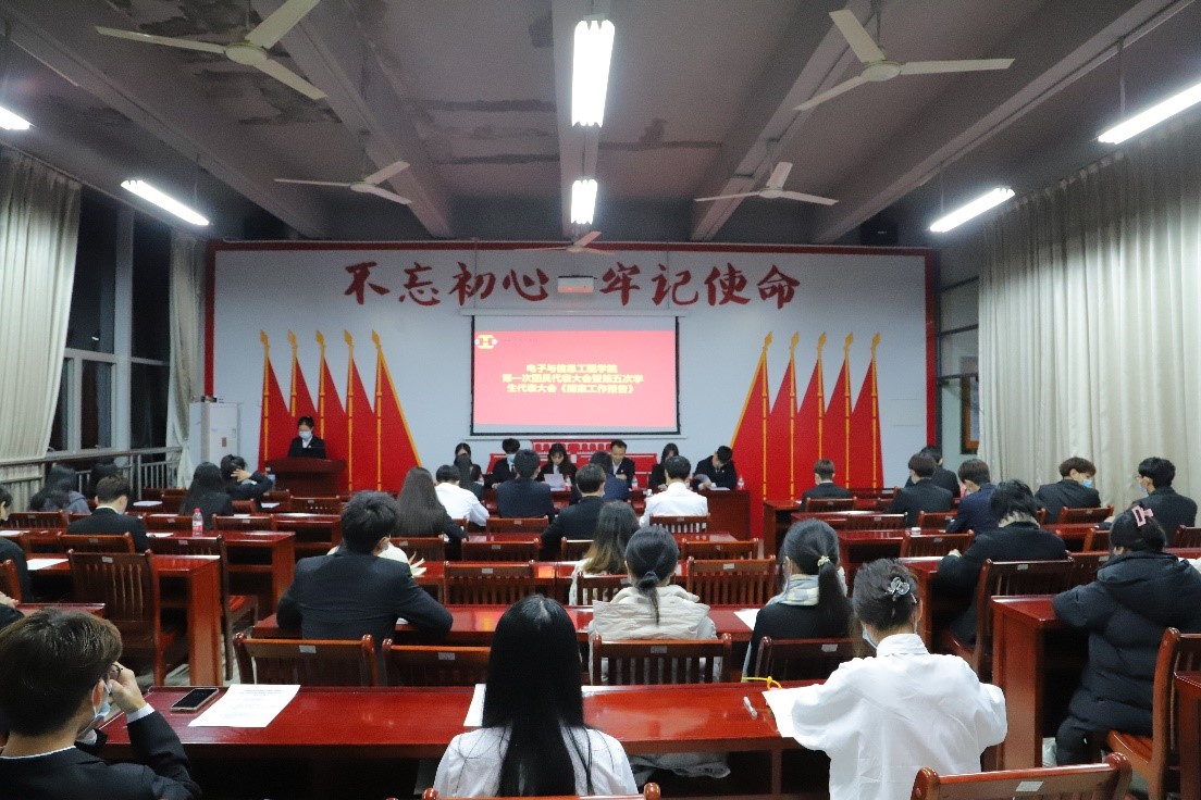 2022年12月6日晚上,我院召开第一次团员代表大会暨第五次学生代表大会。电子与信息工程学院院长王富宽、党总支副书记徐国辉、团委书记罗细兵,20级主席团全体成员及学生代表出席本次代表大会。