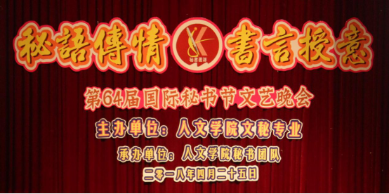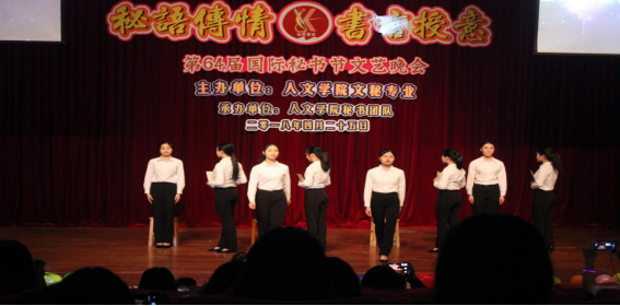 2018年4月25日晚,以“秘语传情,书言授意”为主题的第64届国际秘书节文艺晚会在完美(中国)的学术报告厅隆重举行,本次活动由人文学院文秘专业主办,人文学院秘书团队承办。人文学院团总支书记谢国栋老师、文秘专业老师、文秘专业2016、2017级全体同学以及部分其他专业同学参加了此次秘书节庆祝活动。