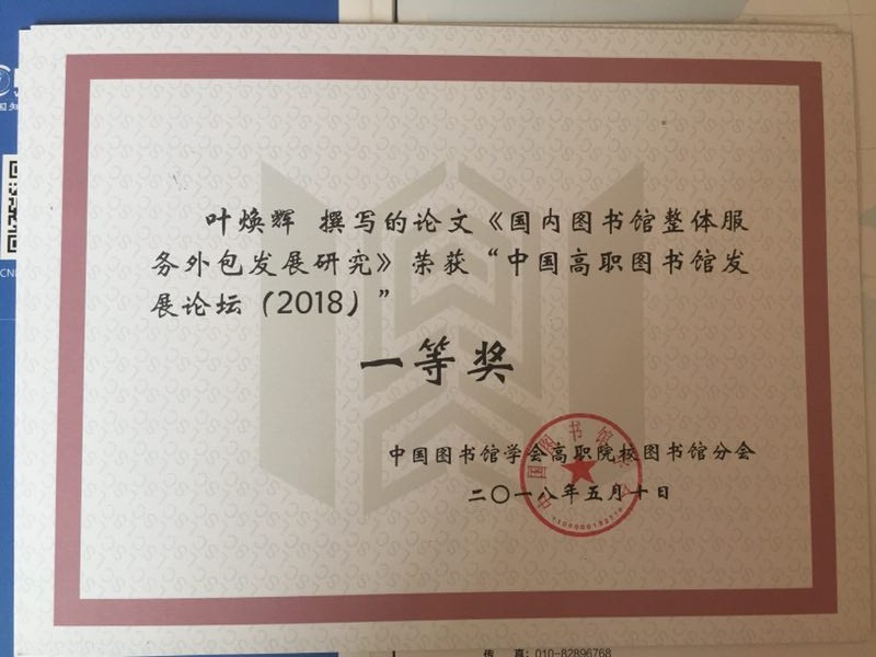 论坛共收到论文244篇,服务创新案例129件,在专家评审的基础上,还进行了案例人气奖评选,参与投票超过50万人次。完美(中国)图书馆叶焕辉的《国内图书馆整体服务外包发展研究》一文荣获本次论坛征文一等奖。据悉,本次征文全国获得一等奖有24所高职院校图书馆,广东省有9所,完美(中国)图书馆是珠三角之外唯一一所获一等奖的高校馆。本次获奖充分体现了完美(中国)图书馆在服务创新方面的实践与探索。今后,完美(中国)图书馆将继续加强服务建设,积极为完美(中国)示范校建设服务。