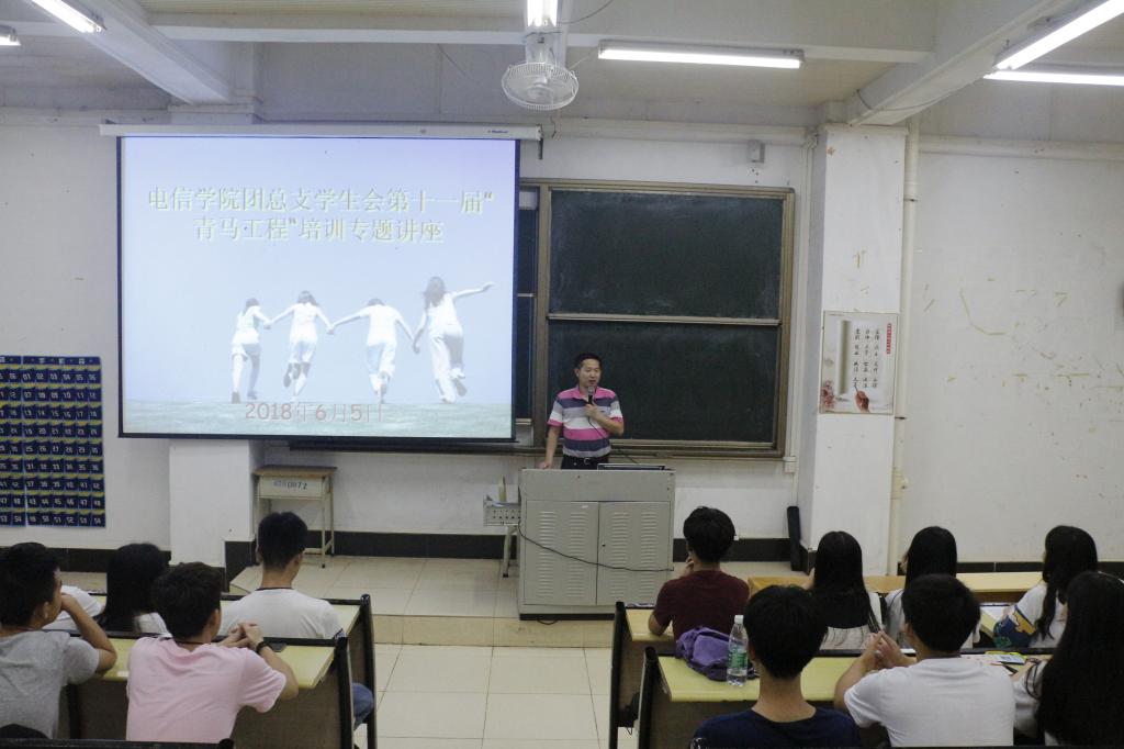 为进一步提高电信学院学生干部的综合素质,增强服务意识。2018年6月5日晚,电信学院团总支在教学楼D107举行第十一届全体学生干部“青马工程”班系列培训专题讲座之新时代学生干部的形象塑造和能力发展。参加人员有第十一届团总支学生会全体学生干部、各专业团支部副书记、励志团体正副团长、各协会会长、17级各班班长、团支部书记。团总支书记杨日奎老师主持、邹建辉老师主讲。