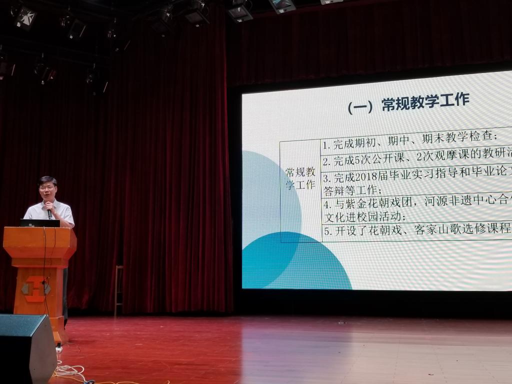 会议分为两个流程:一是本学期的工作总结;二是下学期工作部署。首先杜伟祥院长总结了教学、党建、学生工作、校企、科研等工作的亮点。如有开设紫金花朝戏团、客家山歌选修课、音乐教育专业与嘉应学院音乐与舞蹈学院成功合作开展“三二分段专升本应用型人才协同培养”项目,各种校级、省级赛事等比赛,均取得良好的成绩。党建工作以学习习近平总书记系列重要讲话精神为重点,增强“四个意识”,以深化“两学一做”学习教育为抓手,持续改进党员作风。校企合作总计进账188236元,培训6179人次。科研上获各类省级课题立项8项,市级课题立项11项等。这个假期还承办“2018连平县暑期乡村小学音、体、美兼职教师培训班”等工作。