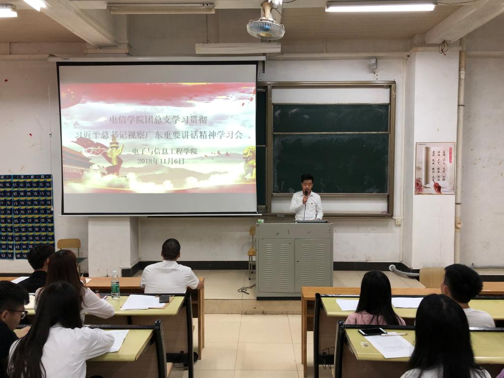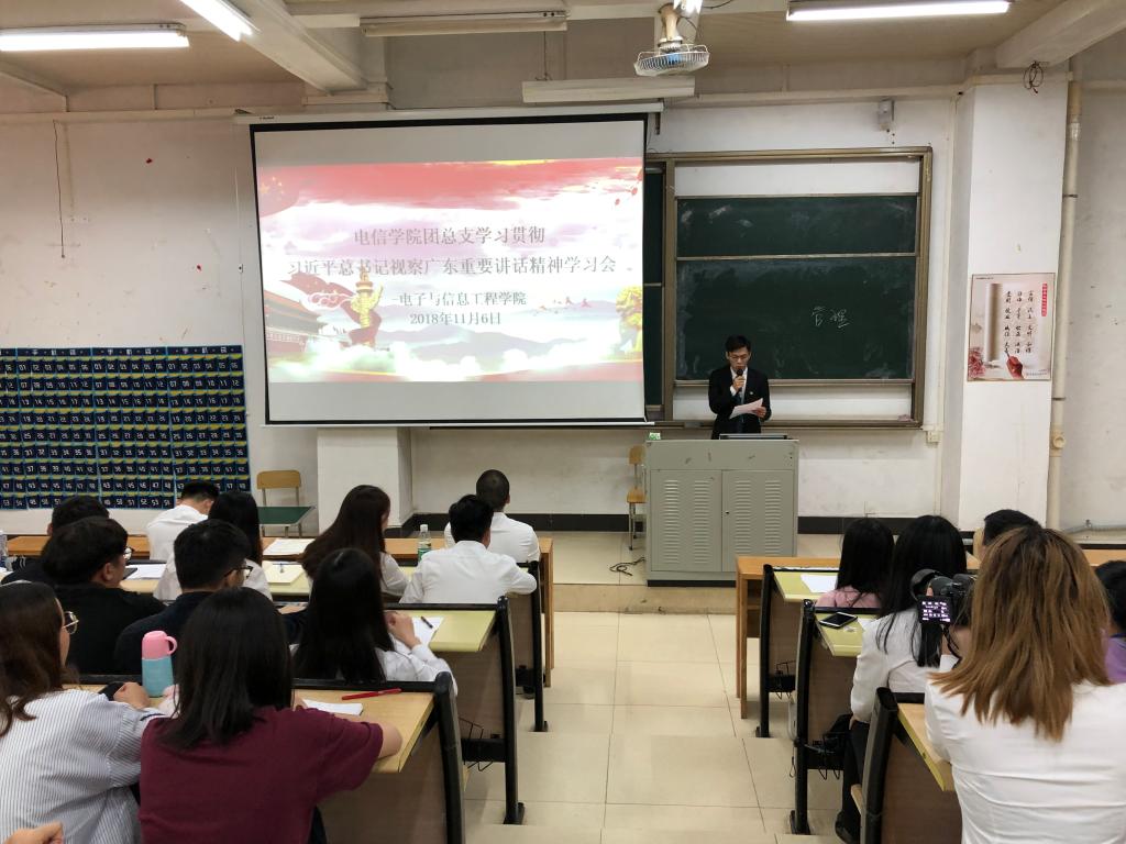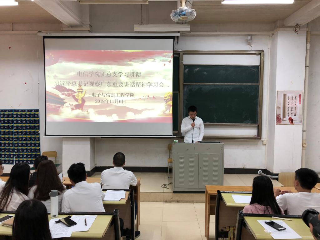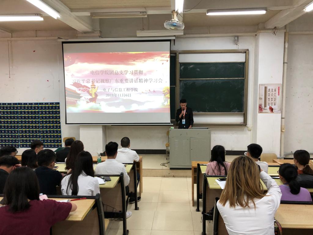 11月6日下午,电信学院团总支在教学楼D108召开“学习贯彻习近平总书记视察广东重要讲话精神”专题学习会。参加学习会的人员有:电信学院团总支学生会全体学生干部、专业团支部成员、各班级班长、团支部书记、组织委员、各协会正副会长。学习会由团总支书记杨日奎主持。
